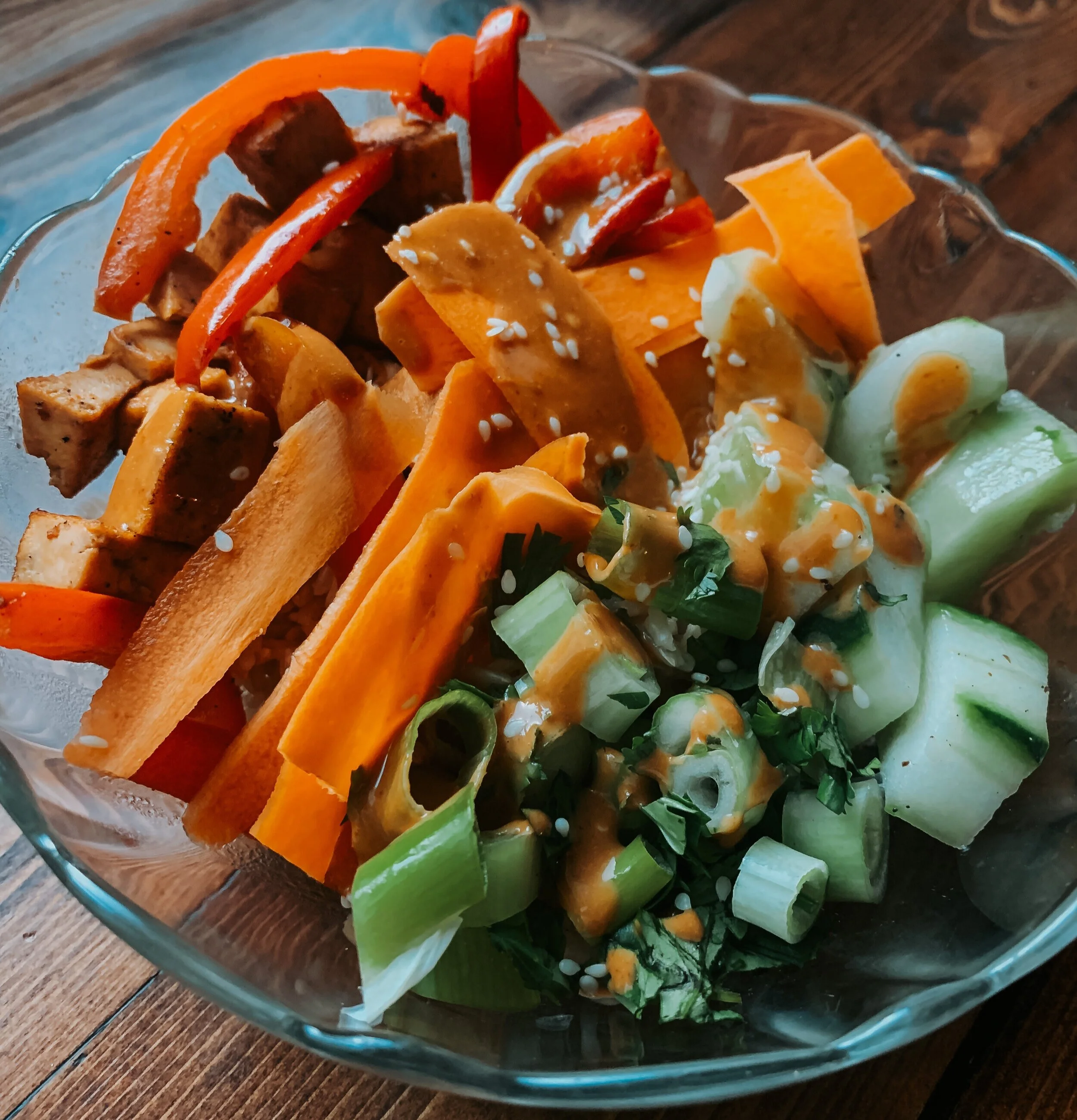 - Assemble Bowl. Start with rice and add tofu & peppers, carrots, cucumbers, scallions, cilantro, and sesame seeds. Pour as much sauce you want over the bowl.